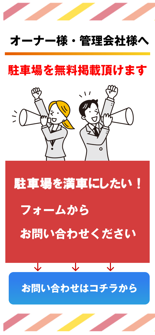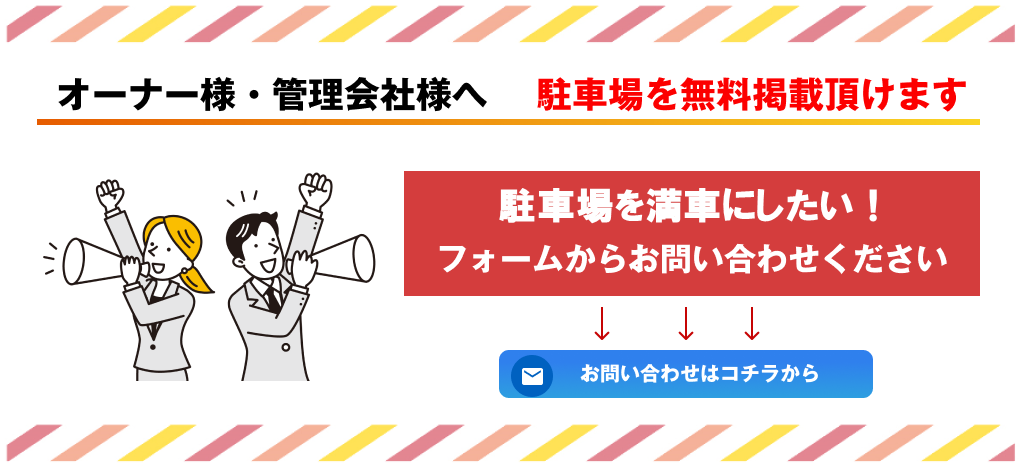 オーナー様・管理会社様の駐車場情報を弊社担当者へお伝え頂くのみで掲載可能です。もちろん掲載は無料!